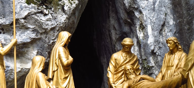 Verse: When it was evening, there came a rich man from Arimathea named Joseph, who was himself a disciple of Jesus. He went to Pilate and asked for the body of Jesus; then Pilate ordered it to be handed over. Taking the body, Joseph wrapped it in clean linen and laid it in his new tomb that he had hewn in the rock. Then he rolled a huge stone across the entrance to the tomb and departed. But Mary Magdalene and the other Mary remained sitting there, facing the tomb. (Luke 23:33-35)